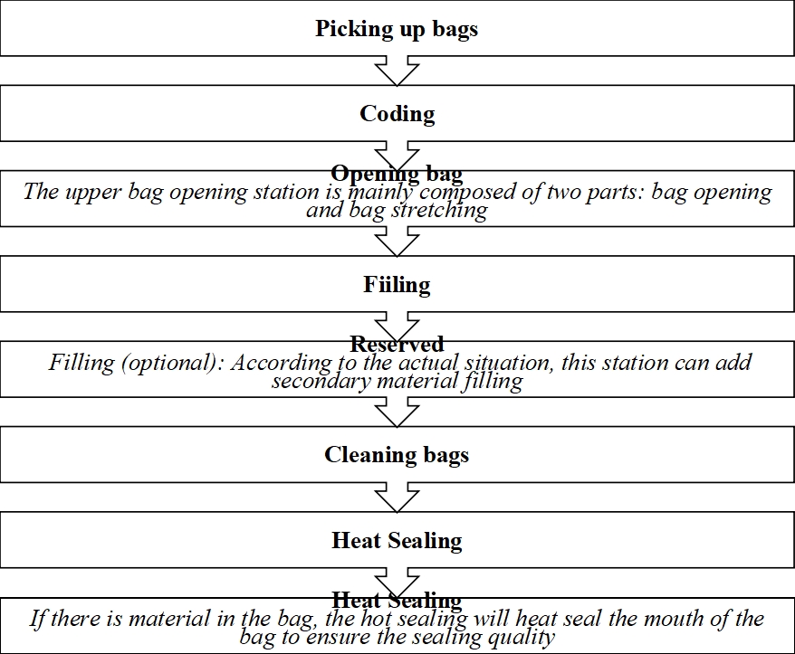6. The machine is equipped with an automatic detection device, which can detect the failure of air pressure, temperature controller, bag on the machine, bag mouth or not open. It can judge the state of the machine, control whether the machine is coded, whether the filling device is filled, and whether the hot sealing device is sealed, so as to avoid the waste of packaging materials and raw materials and greatly save the cost.